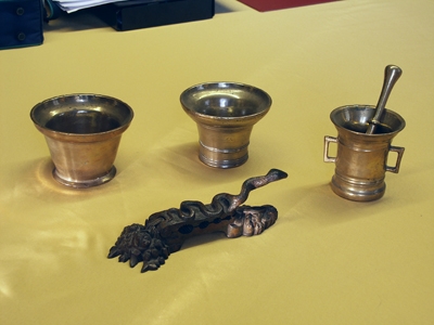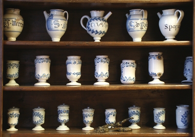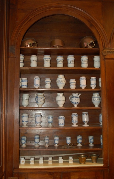 Son apothicairerie renferme un précieux mobilier : mortier de bronze ouvragé, cruches et pots de pharmacie au décor fleuri, pots et chevrettes de la faïencerie lyonnaise…